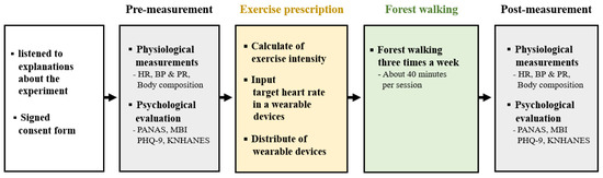 The experiment comprised pre-measurement, exercise prescription, forest walking, and post-measurement stages (Figure 2). Participants were restricted from consuming caffeine, meals, or cigarettes, all of which could affect the body’s physiological responses, 2 h prior to the start of the experiment.