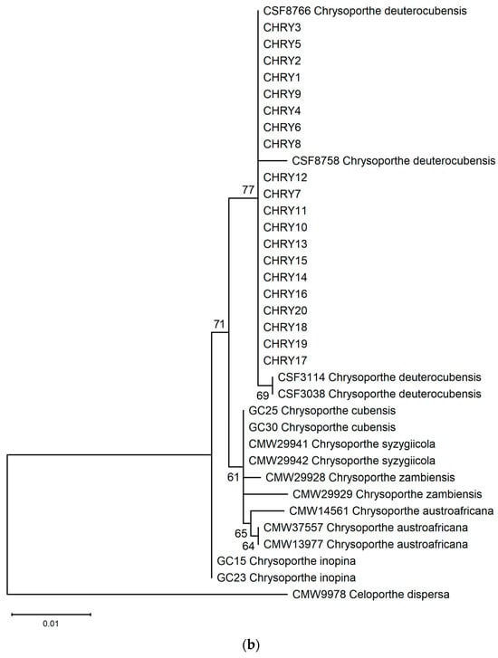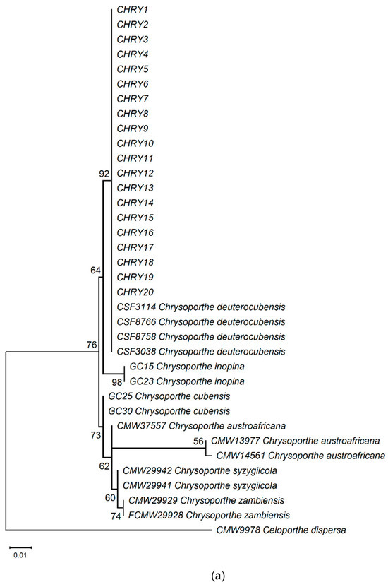 The ML phylogeny in Figure 6 shows that the 20 isolates (CHRY1–CHRY20) were grouped in the same clade with C. deuterocubensis (CSF3038, CSF3114, CSF8756, and CSF8766) in all three phylogenies. For the ITS phylogeny (Figure 6a), C. deuterocubensis was separated as a sister clade to other species, including Chrysoporthe cubensis, Chrysoporthe syzgiicola, Chrysoporthe zambiensis, and Chrysoporthe austroafricana (71% bootstrap value). In contrast, the BT2 phylogeny (Figure 6b) showed that C. deuterocubensis formed a sister group with Chrysoporthe inopina and separated from other species (76% bootstrap value). Comparatively, a multilocus phylogeny (Figure 6c) from the combined ITS and BT2 sequences recorded a similar pattern as the individual isolates and was grouped with C. deuterocubensis and separated from other species (68% bootstrap value). The BLASTn results of the ITS and BT2 sequences in the NCBI database and phylogeny trees confirmed that all the Chrysoporthe isolates from this study were identified as C. deuterocubensis.