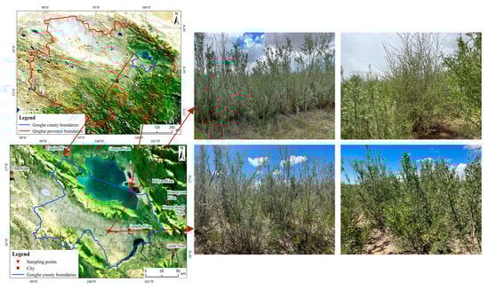 The research area is located in Shazhuyu Township, Gonghe County, Qinghai Province, and relies on the Desert Ecosystem Positioning Research Station (99°45′–100°30′ E, 36°03′–36°40′ N, elevation 2871–3870 m) for experimentation. The area features a typical plateau continental climate, belonging to a high-cold arid and semi-arid region. The average annual temperature is 2.4 °C, with an average annual precipitation of 246.3 mm and an average potential evaporation of 1716.7 mm []. The seasonal distribution is uneven, with atmospheric precipitation mainly concentrated from May to September, with around 50% of the annual rainfall occurring in July and August. The dry and wet seasons are quite distinct. The primary soil type in the research area is fine sandy soil. The artificial vegetation mainly includes Caragana liouana, Populus cathayan, Salix cheilophila, Hippophae rhamnoide, Artemisia desertorum, and others (Figure 1).