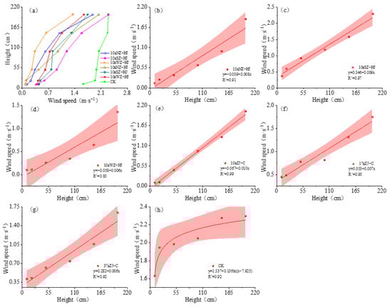 Wind speed profiles of different windbreak and sand fixation forest plots. The figure shows the wind speed profiles for all study sites in sub-figure (a), while sub-figures (b–h) represent the fitted curves of wind speed variation with height for the 10aNZ-HJ, 10aSZ-HJ, 10aWZ-HJ, 10aZJ-C, 17aZJ-C, 37aZJ-C, and CK study sites, respectively.