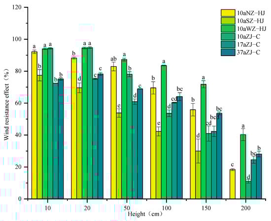Wind prevention efficiency values under different forest stands. The lowercase letters represent significant differences at the 0.05 level.