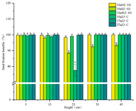 Sediment transport variation is an important indicator of surface wind erosion, providing a clear reflection of the sand-retention benefits of different underlying surfaces and serving as a critical measure of the severity of sand damage in sandy regions []. The cumulative sand transport volume overall demonstrated the following trend: 37aZJ-C < 17aZJ-C < 10aWZ-HJ < 10aNZ-HJ < 10aZJ-C < 10aSZ-HJ < CK. In comparison to the other plots, the 10aSZ-HJ plot exhibited the largest cumulative sand transport volume of 6.10 g, significantly surpassing the others (p < 0.05). The 10aZJ-C plot came next, with a cumulative sand transport volume of 4.58, substantially greater than the 10aWZ-HJ, 10aNZ-HJ, 37aZJ-C, and 17aZJ-C plots (p < 0.05). The plot with the least cumulative sand transport volume was the 37aZJ-C plot, which recorded a sand transport volume of 0 g. Among them, the sediment transport height in the 10aSZ-HJ site is the highest at 45 cm, whereas in the 37aZJ-C site, there is no sediment transport, resulting in the lowest sediment transport height. The sediment transport heights in the remaining sites are all 25 cm. (Supplementary Table S2). From Figure 6, At a height of 5 cm from the ground, the sand stabilization effect of the 37aZJ-C plot was significantly superior to that of other plots (p < 0.05). At 15 cm, although there was no significant difference in the sand stabilization effects between 17aZJ-C and 37aZJ-C plots (p > 0.05), they were both markedly superior to other plots (p < 0.05). The sand stabilization effects of the 10aNZ-HJ, 10aSZ-HJ, 10aWZ-HJ, 10aZJ-C, 17aZJ-C, and 37aZJ-C plots were all above 95% within 15 cm from the ground. This suggests that vegetation can effectively reduce surface wind and sand activity. The average sand-fixing benefits of each site are 99.59%, 94.31%, 99.76%, 95.17%, 99.92%, and 100%, respectively. Overall, the sand-fixing benefits of the sites are ranked as 37aZJ-C > 17aZJ-C > 10aWZ-HJ > 10aNZ-HJ > 10aZJ-C > 10aSZ-HJ.