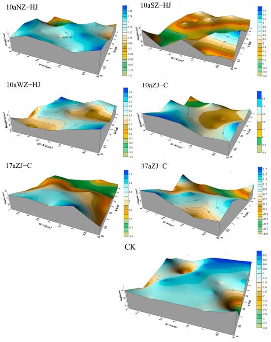The results in Table 3 show that all sites generally exhibit an accumulation state. In the Caragana liouana pure forest, the relative accumulation areas of the 10aZJ-C and 17aZJ-C sites both reached 76.00%. With increasing stand age, the relative accumulation area decreased. In the 10-year-old Caragana liouana pure forest, the erosion depth ranged from −1 to 2 cm, with the lowest point decreasing by 0.6 cm and the highest point increasing by 1.5 cm. The 17aZJ-C site showed slight undulations, with the erosion depth ranging from −1 to 3 cm, and the lowest point decreased by 0.6 cm. In the 0–3 cm depth range, the relative accumulation area distribution was 76.00%. The 37aZJ-C site exhibited significant fluctuations in surface undulation, with the erosion depth ranging from −1 to 2 cm, and the lowest point decreased by 1.00 cm. In the 0–2 cm depth range, the relative accumulation area distribution was 68.00%. In the mixed forest, the 10aWZ-HJ site had the largest relative accumulation area at 88.00%, with the erosion depth ranging from −2 to 3 cm. The lowest point decreased by −1.4 cm, and the highest point increased by 2.8 cm. The 10aSZ-HJ site had a relative accumulation area of 84.00%, with the erosion depth ranging from −1 to 3 cm, and the lowest point decreased by 0.6 cm. The 10aNZ-HJ site had the smallest relative accumulation area at 68.00%, with slight undulations, and the erosion depth ranged from −2 to 2 cm, with the lowest point decreasing by 1.4 cm. In the mobile dune site, the surface undulation was the largest, with the erosion depth ranging from −4 to 0 cm, indicating an erosive state, and the lowest point decreased by 3.3 cm. In the −2 to 0 cm depth range, the relative erosion depth area accounted for 100.00%. According to Figure 8, the average intensity of wind erosion for each site was as follows: 10aWZ-HJ > 10aSZ-HJ > 10aZJ-C > 17aZJ-C > 37aZJ-C > 10aNZ-HJ > CK, indicating that all sites were primarily affected by wind accumulation. The average intensity of wind erosion was the largest in the 10aWZ-HJ site, at 1.11.