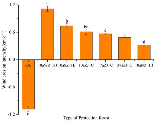 Change of intensity of wind erosion and deposition. The lowercase letters represent significant differences at the 0.05 level.