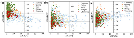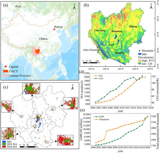 - Liu, Z.; Ding, Y.; Jiao, Y.; Wang, J.; Liu, C.; Xu, Q. Spatiotemporal Variation of Impervious Surface and Abnormal Climate Phenomenon in Central Yunnan Urban Agglomeration. Acta Geogr. Sin. 2022, 77, 1775–1793. [Google Scholar] [CrossRef]