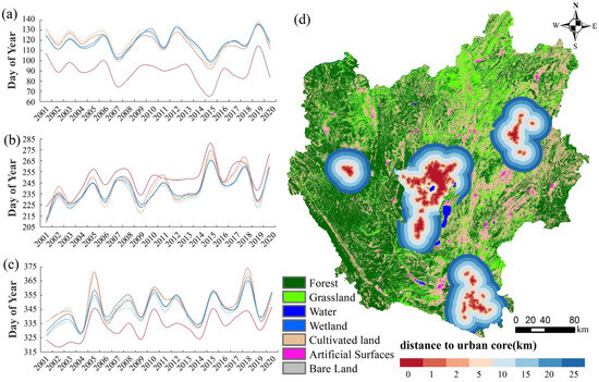3.2.1. Trend of Vegetation Phenology on the Urban–Rural Gradient
