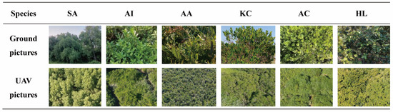 Sampling pictures of different mangrove species captured with a digital camera and UAV in Qi’ao Island.
