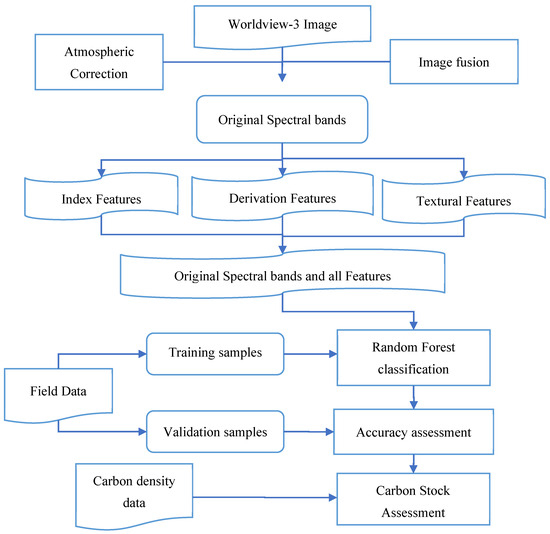 Through pre-processing the Worldview-3 image and calculating index features, first derivative features and texture features, the spectral bands of the Worldview-3 image are combined with all of the above features, and field data and Random Forest classification methods are used for mangrove-species classification. The area of different mangrove species in Qi’ao Island is extracted, and the TCD of Qi’ao Mangrove Reserve is calculated according to the carbon density of different mangrove species. The technical route is described in Figure 3.