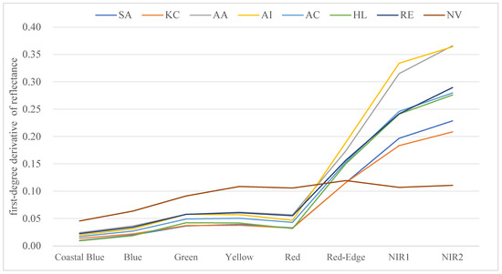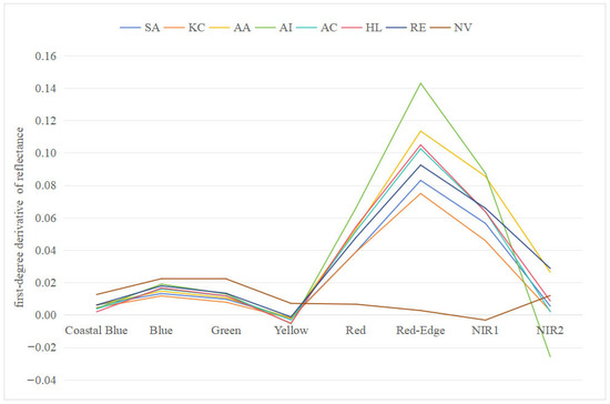 In order to better highlight the spectral differences between different classified objects, we calculated the derivative of the spectral curve [50]. The derivative of the spectral curve, or its mathematical function, estimates the slope of the entire interval [51]. In general, the first-degree derivative is more widely used in the identification of plant spectral features, and in the correlation analysis of spectral information and vegetation information [52]. The first-degree deviation is expressed as follows: