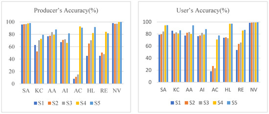 Figure 6 illustrates that the producer’s accuracy and user’s accuracy of NV can consistently achieve high accuracy, even when feature data is not included. This is largely due to the distinct spectral features of NV compared to those of the mangrove species or vegetation. From Table S1, the accuracy of AC was the lowest, with a producer’s accuracy of 8% and a user’s accuracy of 18.18%. The similarity in spectral reflectance led to misclassifications between AC, AA, and RE, as well as between SA, KC, HL, and RE [36]. Table S2 reveals that even after incorporating spectral index features into the classification process, the accuracy of AC and RE remained low. Table S3 indicates that the first-order derivative of spectral bands improved the classification accuracy of HL by 25.28% and RE by 12.51%. This was due to the differences in the first-derivative features between SA, HL, and RE. Table S4 reveals that the combination of textural and spectral features significantly improved the overall classification accuracy, with AC being well distinguished by an improvement of 84.80% in producer’s accuracy and 52.77% in user’s accuracy. When all features were combined into a Random Forest classifier, further improvements in accuracy could be achieved, as seen in Table S5.