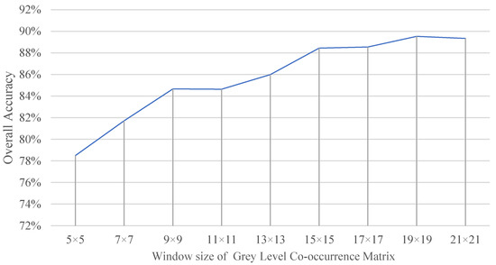 Above, eight texture features were calculated using the red band (Band 5) [58] of WorldView-3 with the windows of 5 × 5, 7 × 7, 9 × 9, etc., until the highest classification accuracy was achieved.