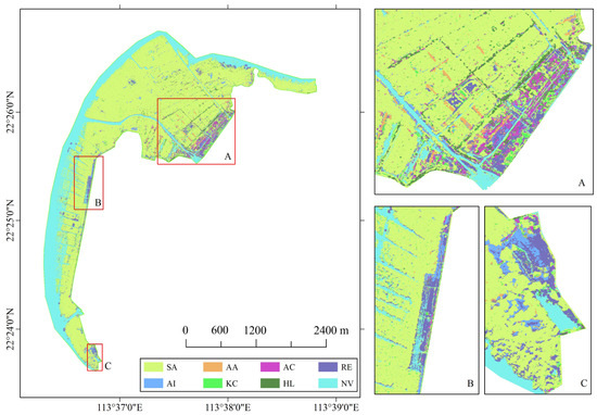 Mangrove species are distributed as follows: SA occupies most of the area, while NV is mainly found around water bodies and tidal flats located in the west and north of the study area or interspersed among SA. AI can be found in the southeast, middle, and south of the study area (regions A, B, and C), mixed with SA. RE or reeds grow alongside AI and are also distributed in local regions A, B, and C. The distribution of AA is relatively scattered, but it appears more frequently in region A. Finally, AA, KC, AC, and HL are mainly grown in region A. Although these mangrove species grow together in a mixed community, the distribution of the same species is relatively concentrated. According to on-site investigations, there is a high concentration of AI, RE, and AA below the crown layer in SA. Due to the limitations of visible-light remote-sensing images, AI, RE, and AA located below the AA crown layer cannot be accurately mapped.