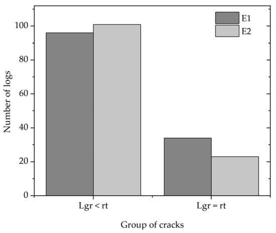 Number of logs with radial cracks at both ends. Radial cracks measured in E1 and E2. Lgr < rt: crack length is smaller than the log’s radius. Lgr = rt: length of the crack is equal to the log’s radius.