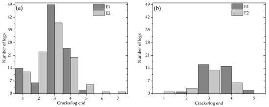 Figure 3 shows the number of radial cracks per log. Figure 3a displays the number of cracks with lengths smaller than the log’s radius. The maximum quantity of cracks found in logs was seven and five, in E2 and E1, respectively. However, most logs had three cracks in both log ends, which were a little bigger in E1, with 49 logs versus 39 in E2. Similarly, 12 and 14 logs had one radial crack in small-end diameter 1 and large-end diameter 2, respectively.
