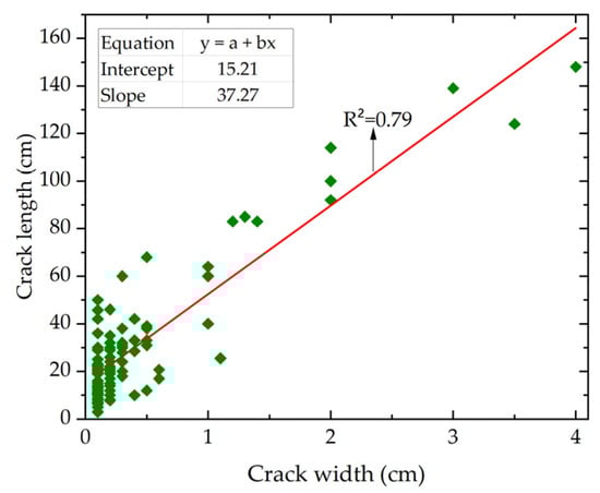 The relationship between the width and length of the longitudinal cracks was determined using a regression model (Figure 4). This relationship showed a high determination coefficient of 0.79%. This indicates that the variability of the crack length can be explained by the crack width variability. It is worth noting that there may be factors not considered in this model that might contribute to explaining better this correlation. Furthermore, the correlation between the crack width and length may be attributed to the physical and mechanical behavior of the wood and its exposure to different conditions. Internal stresses generated by the wood’s structure lead to the formation of cracks. As crack width increases, the tension at the crack edges tends to increase, resulting in greater propagation. This is because the crack edges are under a higher concentration of stress and are more susceptible to separation. Additionally, the wood moisture content plays a significant role in crack propagation, as wider cracks allow for greater moisture penetration into the wood, further weakening the structure and contributing to crack propagation. Similarly, the intrinsic characteristics of the wood contribute to crack propagation. It is important to note that the evaluated pieces had crack widths ranging from 1 to 4 cm, while the longitudinal cracks exhibited a wide range, with a maximum length of 148 cm.