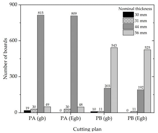 Figure 5 displays the number of boards based on the thickness of the green board and cutting plan (PA-PB). The results indicated that for PA, there were 815 boards with a thickness of 44 mm. For PB, the number of boards was 543 boards, but with a thickness of 56 mm. On the other hand, losses of boards were observed in PB, with 11 and 18 boards with thicknesses of 44 and 56 mm, respectively. These losses represented 4.5% and 3.3% of the total of 203 and 543 boards, respectively. Furthermore, in both cutting plans, all boards with a thickness of 30 mm were classified as rejects (29 boards) because they did not meet the nominal value.