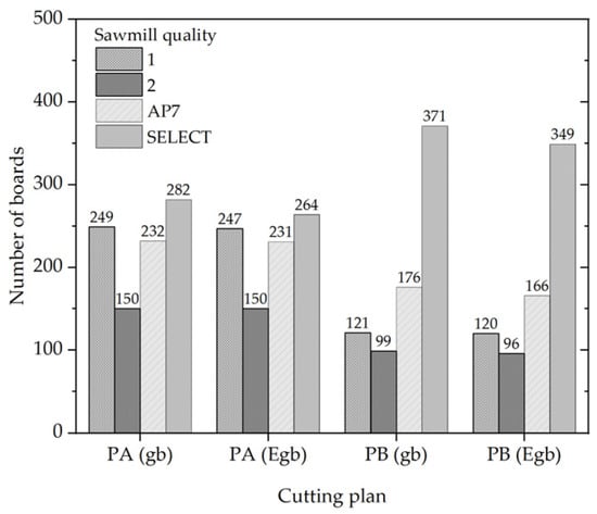 It was found in PA that 282 boards reached the highest value grade, “Select grade”, followed by 249 and 232 grade 1 and AP7-grade boards, respectively. In PB, a higher number of select-grade boards was found compared to PA (Figure 6). Specifically, 371 pieces were counted, followed by 176 and 121 AP7 and grade 1 boards, respectively. When analyzing the board losses for both cutting plans, in PA, there was a loss of 18 select-grade boards. However, for the other grades, loss boards were minimal. In PB, there were 22 select-grade boards and 10 AP7-grade boards. Grades 1 and 2 boards had losses of one and three pieces, respectively.