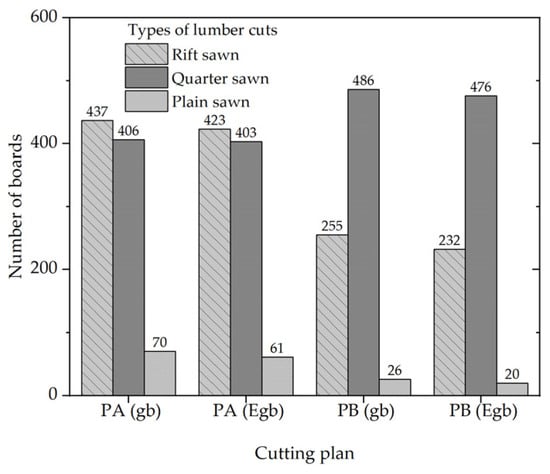 Number of boards by cutting plan and types of wood cuts. PA: log-cutting plan (28–40 cm log diameters); PB: log-cutting plan (42–56 cm log diameters); gb: green board (ungraded board dimensions); Egb: expected green board (planned and classified board dimensions).