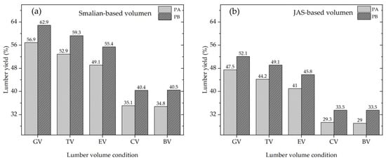 Lumber yield for cutting plans using (a) Smalian equation and (b) JAS standard. GV = green lumber volume; TV = trimmed (without cracks) green lumber volume; EV = expected green lumber volume; CV = commercial lumber volume; BV = billing lumber volume.