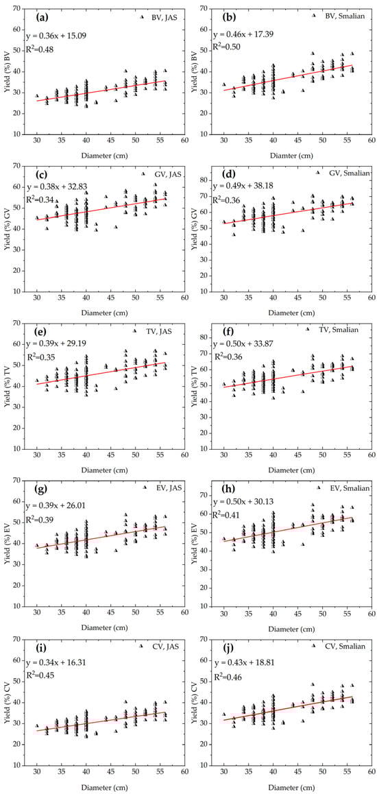 Relationship between log size and lumber yield, according to JAS (a,c,e,g,i) and Smalian (b,d,f,h,j). GV = green lumber volume; TV = trimmed (without cracks) green lumber volume; EV = expected green lumber volume; CV = commercial lumber volume; BV = billing lumber volume.