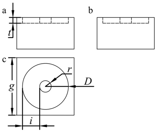 Three views of the structure of the unit: (a) the main view; (b) the side view; and (c) the top view. D is the radius of the outer circle (mm); r is the radius of the inner circle (mm); i is the width of the annulus (mm); g is the length of the side of the square, which is 20 mm; and t is the depth of the groove, which is 2 mm.