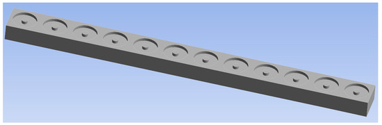 Many wood-related studies using finite element simulation techniques have been reported [31,32]. Wood is in the range of linear elastic variation when it is subjected to free vibration. Modal analysis belongs to the category of linear analysis, so computational modal analysis based on a linear elastic material can be carried out on a wood model using ANSYS 2021R1 [33]. Three-dimensional models of all the structures were constructed using AutoCAD 2017, and a beam model without the circular slot structure was constructed as a control. The overall dimensions of the model were set to 240 mm (X) × 20 mm (Y) × 11 mm (Z) based on the specimen dimensions. One of the models generated in the ANSYS Workbench is shown in Figure 2.