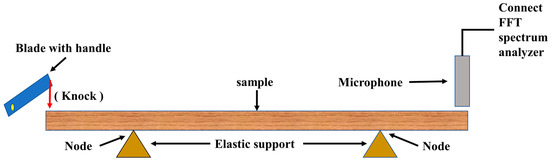 In the experimental test, the specimen was supported by two elastic supports at the nodes of the first-order free vibration, and the excitation was applied with a blade at one end. The microphone at the other end received the vibration signals and input them into a fast Fourier transform (FFT) spectrum analyzer to analyze the signals and determine the f value of the specimen. A schematic of the experimental setup is shown in Figure 3.