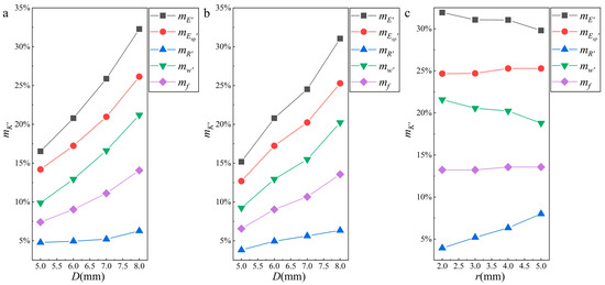 The mK′ values of the nine structures are given in Table 5. The trends of the mK′ values were analyzed, and the results are shown in Figure 5. When r or i was constant, all five mK′ values increased with increasing D, showing a positive correlation between mK′ and D (Figure 5a,b). The changes from fastest to slowest were in the order mE′, mEsp′, mw′, mf, and mR′. When D was constant, mE′ and mw′ decreased with increasing r, and they showed similar trends. Conversely, mEsp′, mR′, and mf increased with increasing r, and mR′ and mEsp′ increased more rapidly than mf (Figure 5c).
