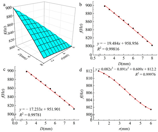 When r = 1 mm and D varied from 3 to 8 mm, f decreased from 898.1 to 812.0 Hz, a change of 9.59%. In addition, there was a noticeable linear negative correlation between f and D.