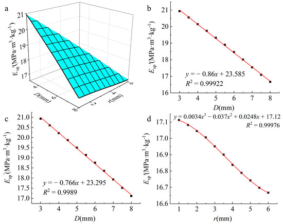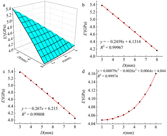 Esp′ decreased with an increase in either D or r, exhibiting a trend that was similar to that observed for f (Figure 8a). Among the 66 data groups, we selected three specific relationships for further analysis: the relationship between Esp′ and D when i = 2 mm (Figure 8b), the relationship between Esp′ and D when r = 1 mm (Figure 8c), and the relationship between E′ and r when D = 8 mm (Figure 8d).
