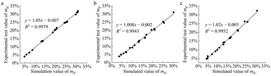 Correlation of mK′ obtained from experiment and simulation. (a): D = 8 mm; (b): i = 4 mm; (c): r = 2 mm.