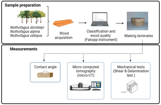Wood samples from three different species were collected from southern Chile. Dry and wet heartwood without defects or knots was used. Lamellae were cut to have clean and flat surfaces, with an average size of 20 mm thickness, 60 mm width, and 60 mm length. Gluing operations were conducted in laboratories at the Pontificia Universidad Católica and Universidad del Bío-Bío, where the moisture content of the wood during gluing varied from 23 ± 2% (around the FSP for each species []). Through experience, part of the timber was conditioned to preserve the moisture, while the other part was dried naturally.