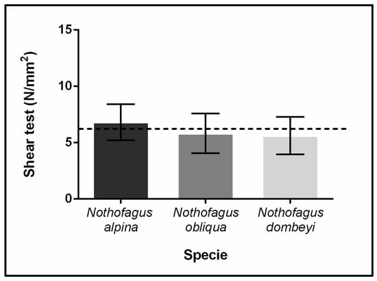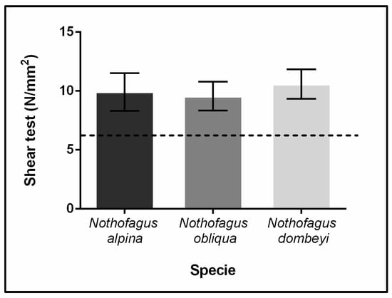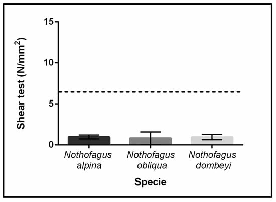 Shear test values of different native species naturally dried. The dashed line indicates the standard value required.