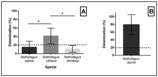 Summary of delamination test value. (A) Results using dry and (B) native timber conditioned. The asterisk indicates a significative difference (p < 0.05). The dashed line indicates the standard value required.