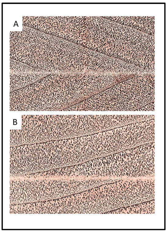 Distribution of porosity into laminates of naturally dried Nothofagus alpina (A) and Nothofagus alpina conditioned (B) by micro-CT.