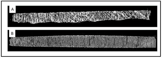 Micro-CT was carried out for the internal morphology of the laminates of native wood. The image shows two tangential cut pieces joined together and one corresponding to the glued line. The laminates made with naturally dried wood showed a similar and uniform pore distribution in the analyzed piece’s transverse layers (Figure 6). However, the porosity values varied among the other native woods, as seen in Table 2.