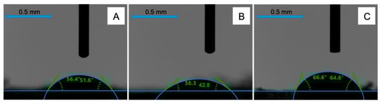 The contact angle and its influence on adhesion were evaluated using the sessile drop technique [] (Figure 8). The surface energies of the dispersed and polar components are presented in Table 3. The contact angle and its influence on adhesion were evaluated using the sessile drop technique, according to Young’s equation (Equation (1)) []