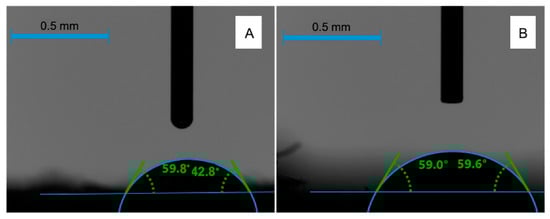Image of a drop of water in contact with the wood surface before gluing with naturally moist timber at a temperature of 20 °C, with a detection time of 3 s for (A) Nothofagus alpina and (B) Nothofagus obliqua.