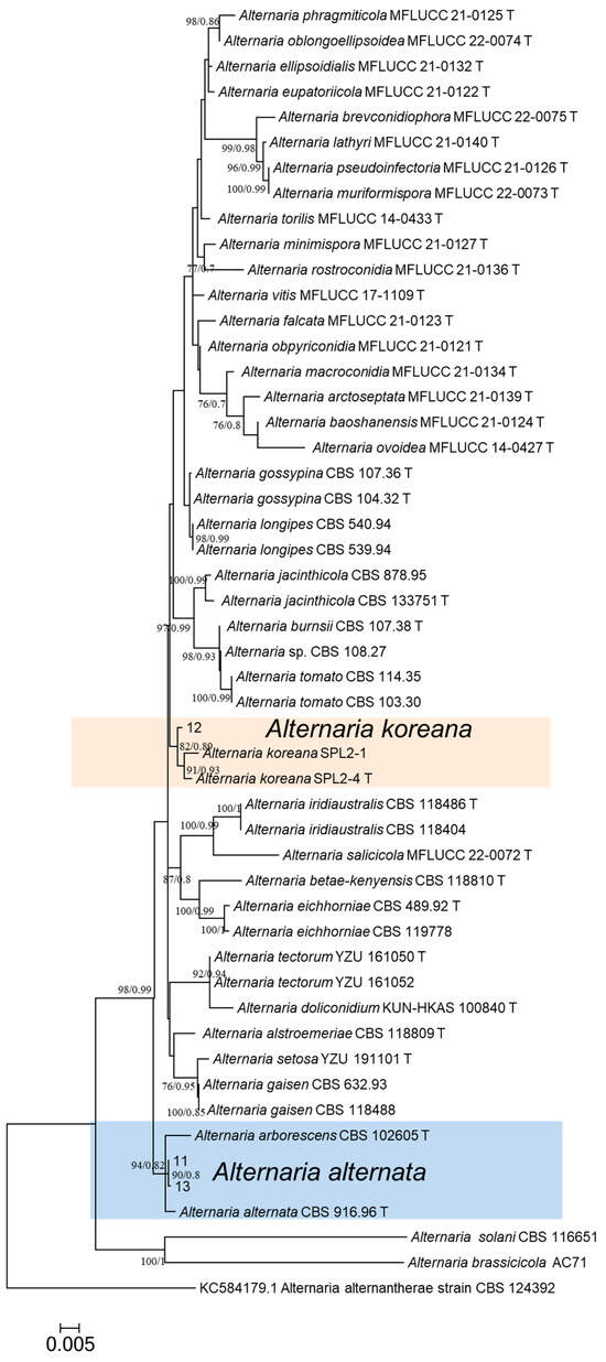 - Romain, B.B.N.D.; Hassan, O.; Kim, J.S.; Chang, T. Alternaria koreana sp. nov., a new pathogen isolated from leaf spot of ovate-leaf Atractylodes in South Korea. Mol. Biol. Rep. 2022, 49, 413–420. [Google Scholar] [CrossRef] [PubMed]