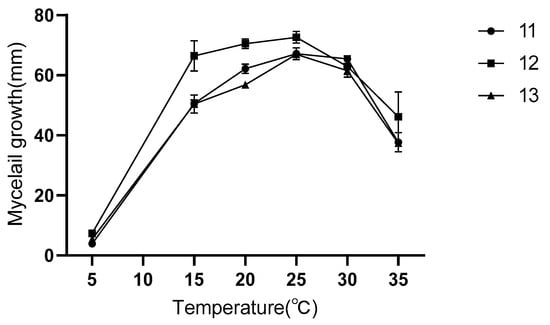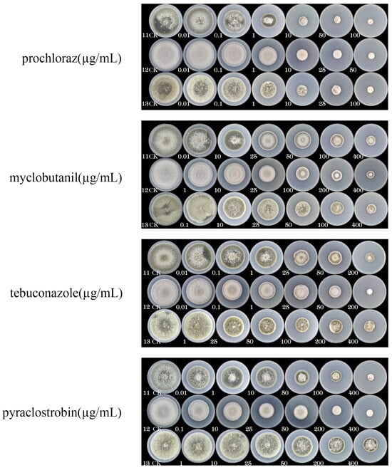 2.6. Evaluation of Fungicides against A. alternata (Isolates 11, 13) and A. koreana (Isolate 12)