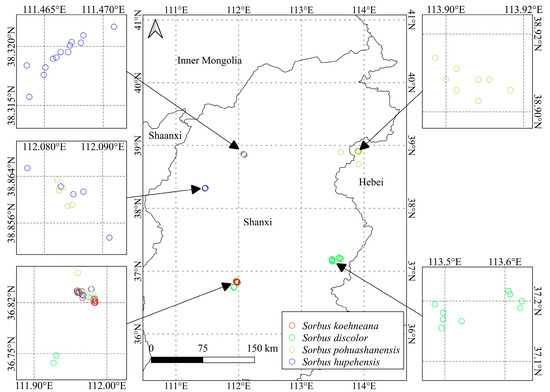 A total of 860 valid distribution points for the Sorbus were obtained from the Global Biodiversity Information Facility (GBIF, www.gbif.org, accessed on 18 July 2023), with 177 distribution points for S. hupehensis, 185 distribution points for S. pohuashanensis, 129 distribution points for S. discolor, and 369 distribution points for S. koehneana. Spatially replicated data exclusion was performed using the “ecospat” package in R. The geographical coordinates of the Sorbus distribution points, along with environmental variables, were used as inputs for Maxent modeling. The probability map of Sorbus distribution points in Shanxi and its surrounding areas is shown in Figure 2.