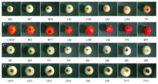Fruit colours among four species of Sorbus spp. (A) (first line): S. hupehensis. (B) (Second line): S. pohuashanensis. (C) (Third line): S. discolor. (D) (Fourth line): S. koehneana. The letters represent different provenances. The number represents the family identifiers. HC: Heicha Mountain, LYS: Luya Mountain, TY: Taiyue Mountain, LS: WT: Wutai Forest Bureau, ZQ: Zuoquan County, SG: Shigao Mountain. (See Table 1 for details).