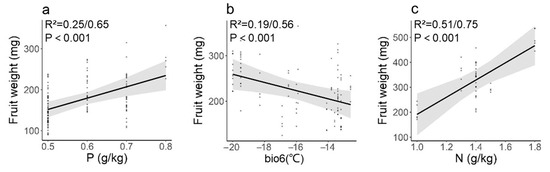 Fruit mass and environmental Factors. (a): S. hupehensis, (b): S. pohuashanensis, (c): S. koehneana. P: Phosphorus, bio6 (°C): min temperature of coldest month, N: nitrogen. The shaded areas represent 95% confidence intervals. R2: Marginal R2/Conditional R2, p < 0.01: highly significant.