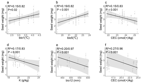 Seed mass and environmental Factors. (a–d): S. hupehensis, (e,f): S. pohuashanensis; bio1 (°C): annual mean temperature, bio5 (°C): max temperature of warmest month, CEC (cmol(+)/kg): cation exchange capacity, K: potassium, bio12 (mm): annual precipitation. The shaded areas represent 95% confidence intervals (same as above).