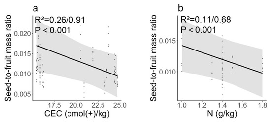 The ratio of fruit mass/seed mass of S. hupehensis exhibits a negative correlation with CEC. Conversely, for S. koehneana, it shows a negative correlation with nitrogen content (Figure 6).
