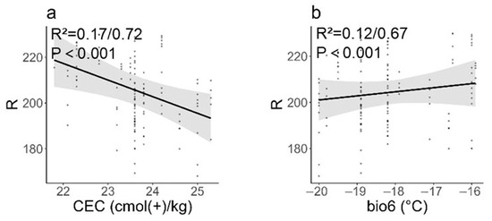Fruit colour (DNR) and environmental Factors. (a): S. hupehensis, (b): S. pohuashanensis. R: DNR, representing the digital numbers in the red colour channel. CEC (cmol(+)/kg): cation exchange capacity; bio6 (°C): min temperature of coldest month (same as above).