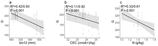 Fruit colour (DNG) and environmental factors. (a,b): S. hupehensis, (c): S. koehneana. G: DNG, representing the digital numbers in the green color channel; bio12 (°C): annual precipitation; CEC (cmol(+)/kg): cation exchange capacity; N: nitrogen (same as above).