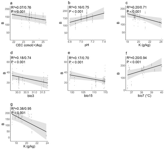 Fruit colour (DNB) and environmental factors. (a–c): S. hupehensis, (d,e): S. pohuashanensis, (f,g): S. discolor. B: DNB, representing the digital numbers in the blue colour channel. CEC (cmol(+)/kg): cation exchange capacity; bio3 (°C): isothermality; bio15 (°C): precipitation seasonality; bio7 (°C): temperature annual range; K: potassium (same as above).