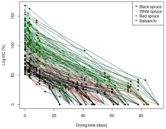 Log moisture content (dry basis) over time. The MC of balsam fir wood was clearly higher than that of spruces.