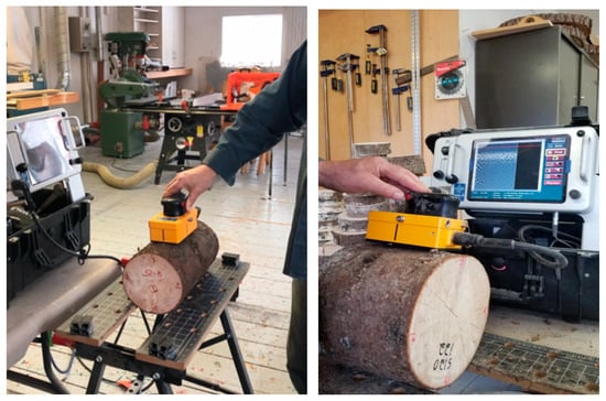 GPR signals were acquired on 257 logs using a MALÅ CX GPR system (MALÅ Geoscience AB, Malå, Sweden) with a central frequency of 1.6 GHz and an antenna separation of 0.06 m. Scans were acquired during a time window of 8.34 nanoseconds (ns) (containing 312 time-sampling points) at a time interval of 0.01 s. Immediately after weighing, each log was placed on a workbench with an adjustable opening such that there was an empty space underneath the log. GPR signals were recorded with the electromagnetic (EM) field oriented perpendicular to fibre direction and the EM wave propagating along the radial direction []. Through-the-bark GPR scans were performed on four positions 90 degrees apart around the middle of the log (Figure 2).